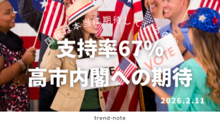 スポーツ 高市内閣の支持率67%──国民は本当に「期待」しているのか? 高市内閣の支持率が67%と高水準を記録しました。一見すると強い支持に見えますが、その中身は「期待」よりも「今は変えたくない」という国民心理の表れとも考えられます。数字の背景と今後の注目点を整理します。 2026.02.11 スポーツ