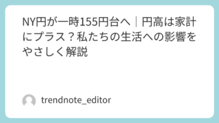 スポーツ NY円が一時155円台へ|円高は家計にプラス?私たちの生活への影響をやさしく解説 NY円相場が一時1ドル=155円台半ばまで円高に。なぜ円高が進んだのか、私たちの家計や物価、生活にどんな影響があるのかを、初心者にもわかりやすく解説します。 2026.02.10 スポーツ