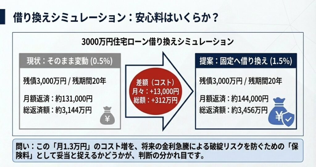 - 変動金利: まだ低水準(0.3-0.5%程度)だが、日銀の政策次第で上昇リスク
