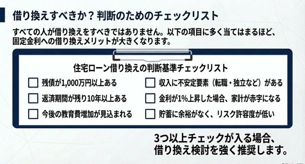 借り換えメリットが大きいケースは、残債1,000万円以上、残期間10年以上が目安です。