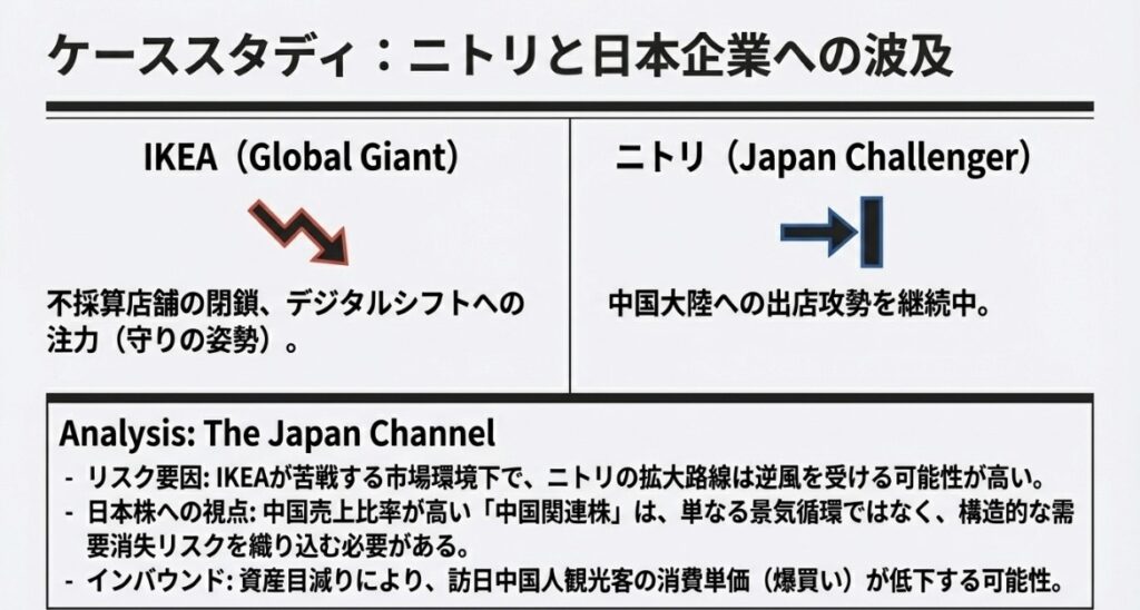 イケアの店舗閉鎖は、単なる経営合理化ではなく、中国経済の構造的減速を映す鏡とも言えます。