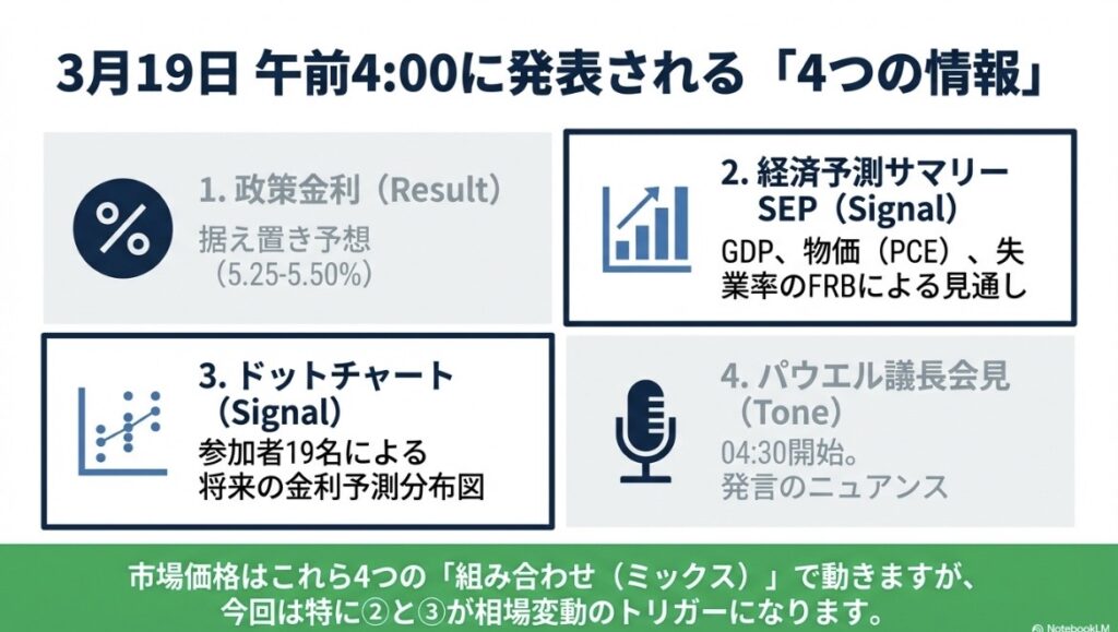 今回は「経済予測サマリー(SEP)」と「ドットチャート」が発表される年4回のうちの1回目で、市場が最も注目しています。